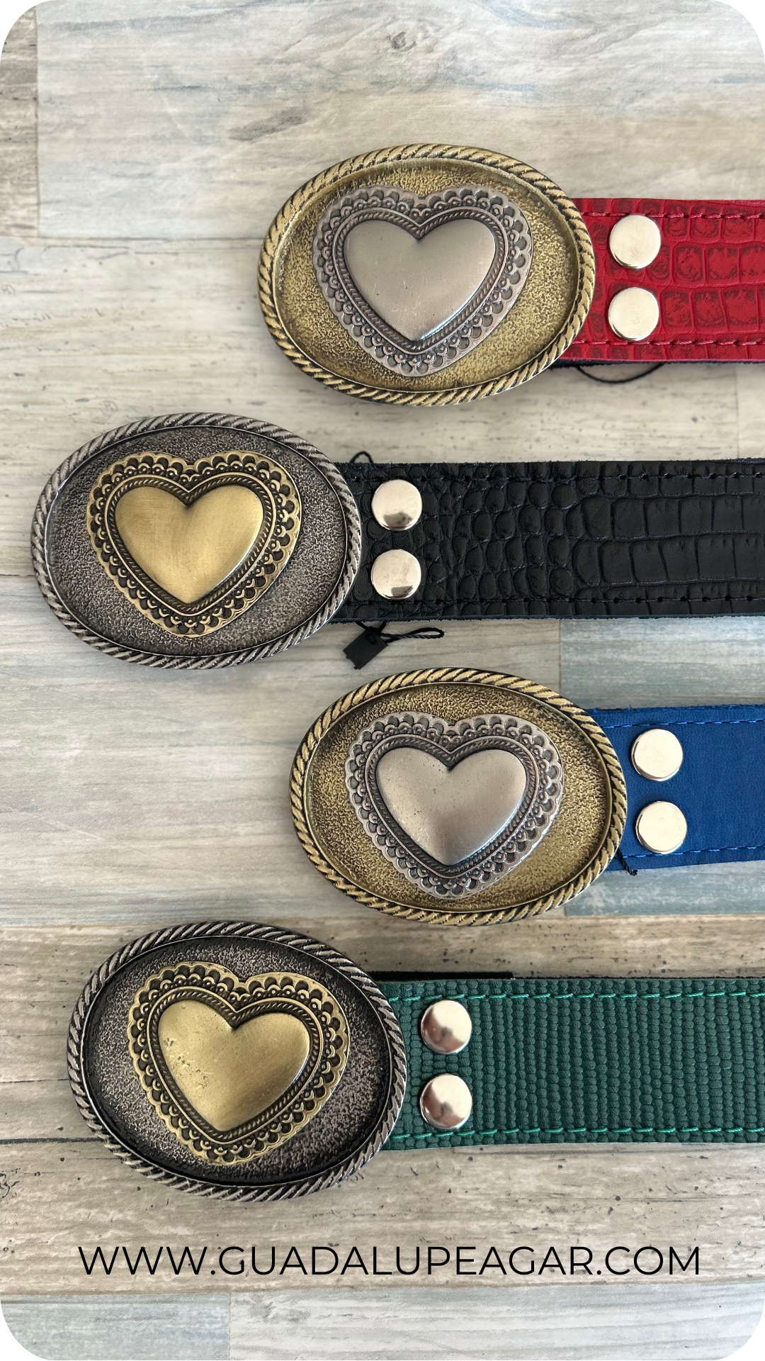 Este cinturón de cuero presenta una hebilla de corazón y permite la opción de intercambiar sus hebillas.